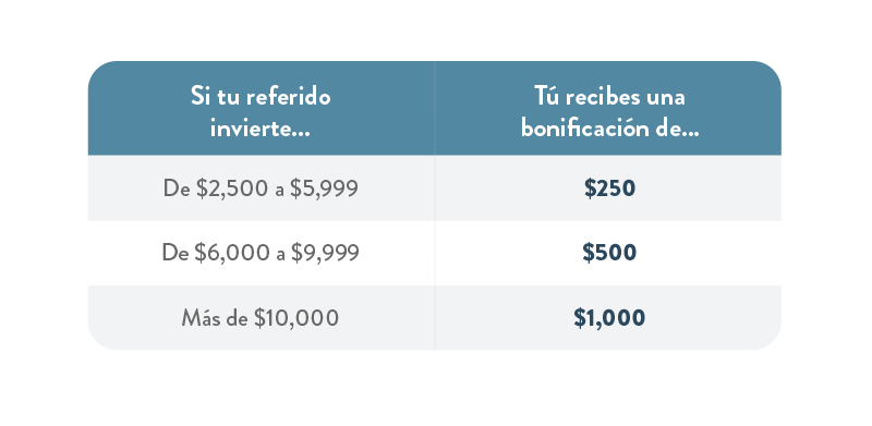 Si tu referido invierte en los primeros 30 días (consulta la bonificación en la siguiente tabla):